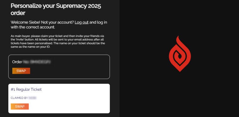 Voordat we je kunnen verwelkomen bij Supremacy, willen we je erop wijzen dat het vereist is om alle tickets in je bestelling te personaliseren om ze te ontvangen.