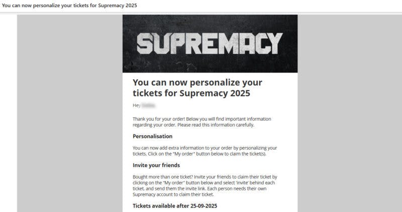 Direct na de aankoop van je tickets zou je (de hoofdboeker) een e-mail van Supremacy hebben ontvangen met een verzoek om je tickets te personaliseren. Zoek deze e-mail op in je inbox (of spam) en klik op de personalisatielink.